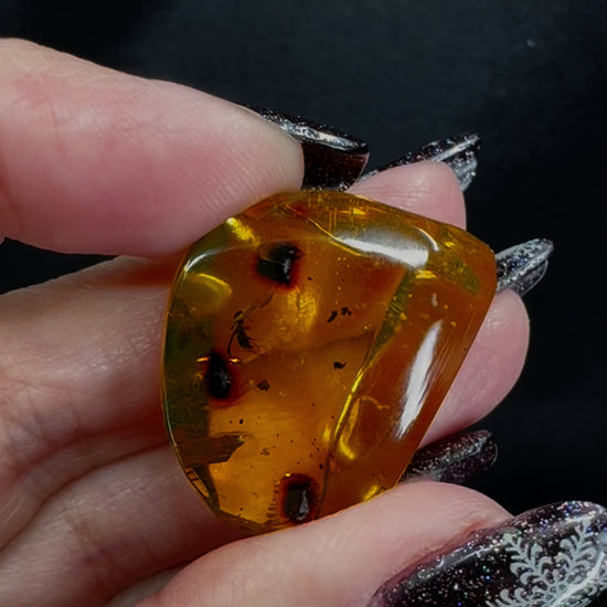 Amber is the fossilized resinous tree sap from conifer trees, which over the course of millions of years becomes solid while retaining the semitransparent yellowish hue of tree sap. While in its sticky gel state, it is not uncommon for insects and other small animals to become trapped within tree sap, and under optimal conditions these insects will be clearly visible within the fossilized amber pieces. These high quality and exceptional color Chiapan Amber originated in Mexico during the Oligocene, roughly 20 million years ago. Each contains at least one (most several) clearly visible insect.