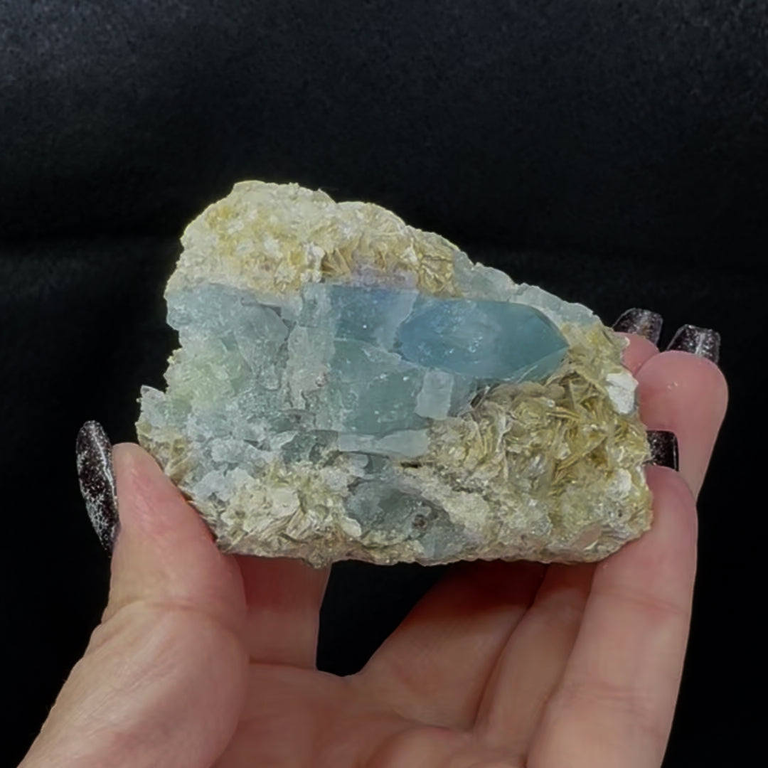 Aquamarine is a form of Beryl crystal long sought after as a gem and precious stone due to its beautiful blue-green hue and clarity. It is found in many sites across the world, typically associated with granitic pegmatites, and is one of the more common gems although pieces of exceptional hue and clarity are considered fairly rare and can be extremely valuable. Aquamarine has a hexagonal crystal structure and is highly prismatic.
