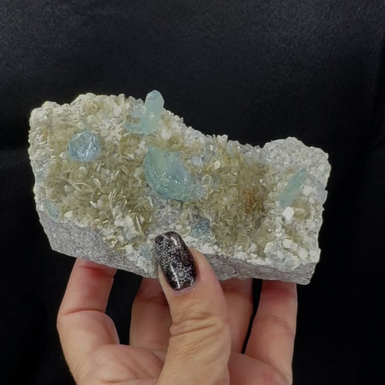 These incredible specimens of natural uncut aquamarine from Mount Little Xuebaoding in Sichuan, China, are found in a matrix of thick, high shine mica and range in hue from nearly clear to classic sea green to deep blue. Each of these pieces contain remarkable aquamarine crystal formations - some gem quality - for the true collector.