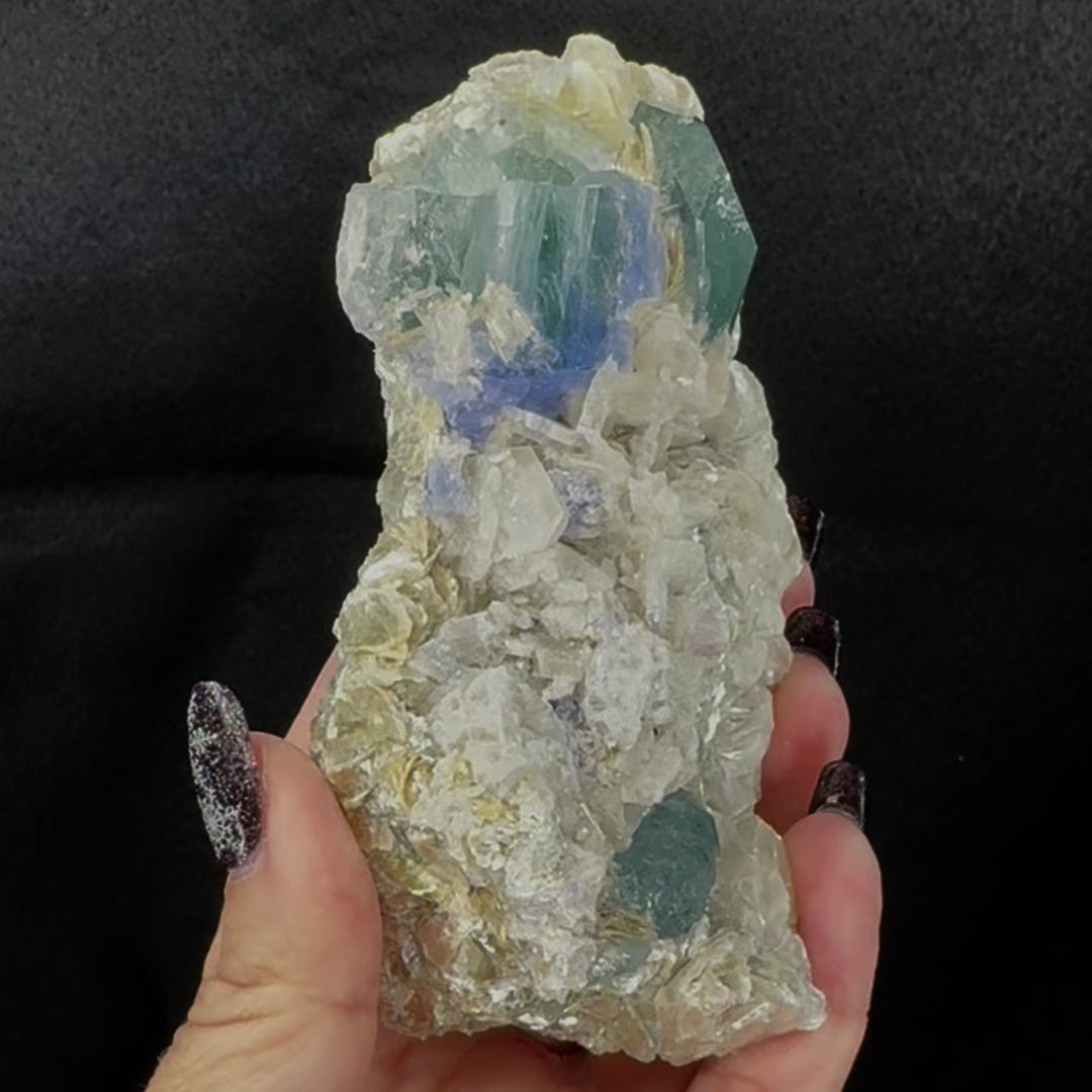 Incredible specimens of natural uncut aquamarine from Mount Little Xuebaoding in Sichuan, China, are found in a matrix of thick, high shine mica and range in hue from nearly clear to classic sea green to deep blue. Each of these pieces contain remarkable aquamarine crystal formations - some gem quality - for the true collector.