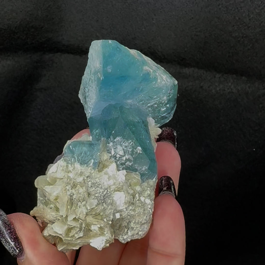 Aquamarine is a form of Beryl crystal long sought after as a gem and precious stone due to its beautiful blue-green hue and clarity. It is found in many sites across the world, typically associated with granitic pegmatites, and is one of the more common gems although pieces of exceptional hue and clarity are considered fairly rare and can be extremely valuable. Aquamarine has a hexagonal crystal structure and is highly prismatic.