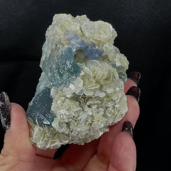 Incredible specimens of natural uncut aquamarine from Mount Little Xuebaoding in Sichuan, China, are found in a matrix of thick, high shine mica and range in hue from nearly clear to classic sea green to deep blue. Each of these pieces contain remarkable aquamarine crystal formations - some gem quality - for the true collector.