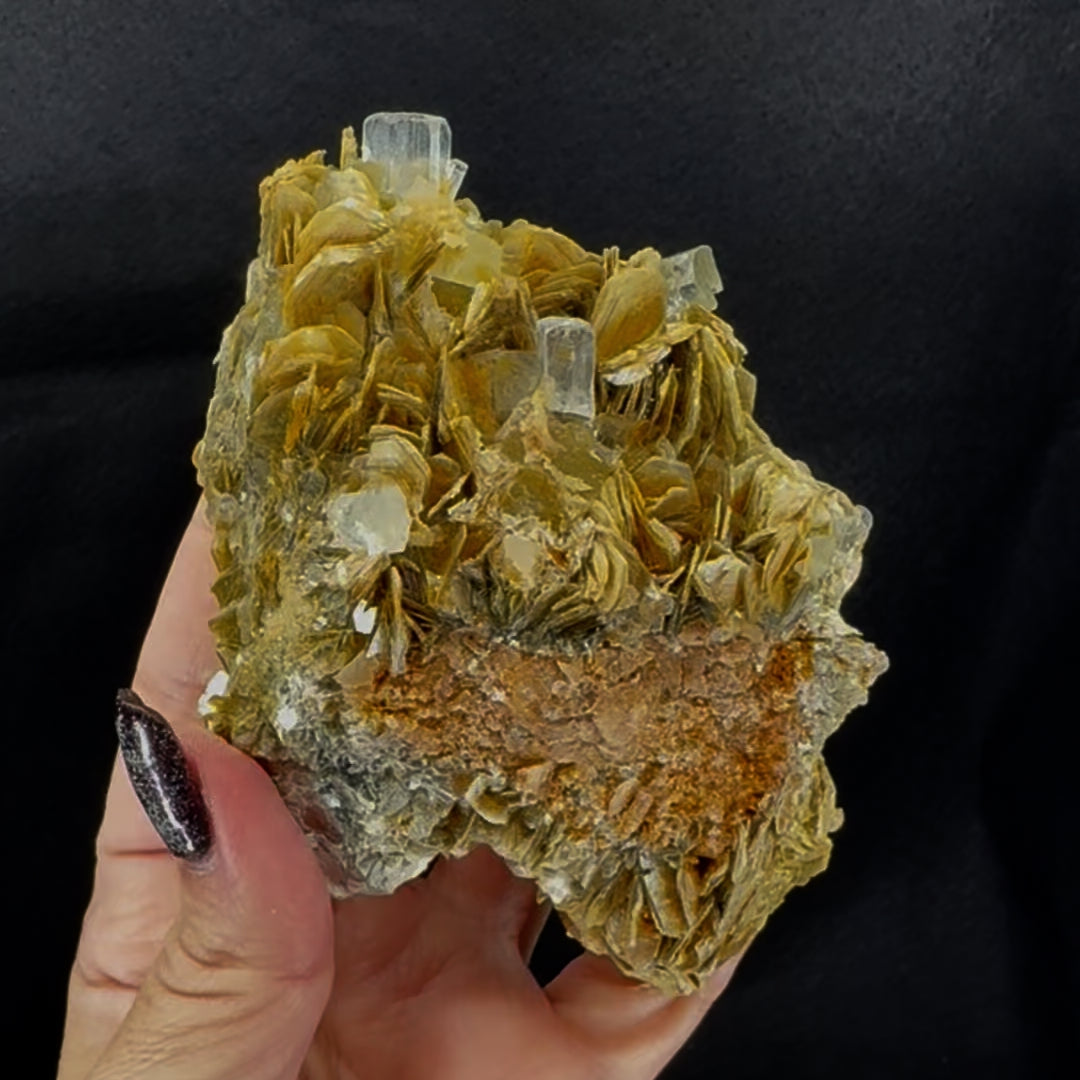 These specimens of natural uncut aquamarine occur within a unique matrix of thick mica with a strong yellowish tint, accentuating the clear sea green of the superb quality crystals.