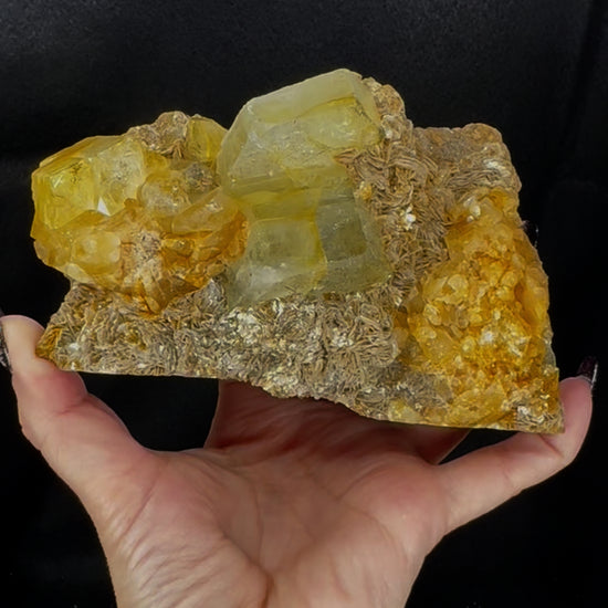 These specimens of natural uncut aquamarine occur within a unique matrix of thick mica with a strong yellowish tint, accentuating the clear sea green of the superb quality crystals.