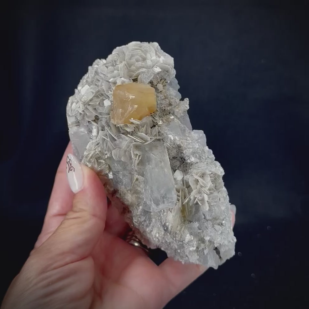 These specimens of natural uncut aquamarine occur within a unique matrix of thick mica with a strong yellowish tint, accentuating the clear sea green of the superb quality crystals.