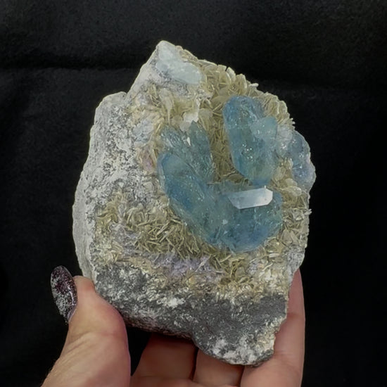 These incredible specimens of natural uncut aquamarine from Mount Little Xuebaodoing in Sichuan, China, are found in a matrix of thick, high shine mica and range in hue from nearly clear to classic sea green to deep blue. Each of these pieces contain remarkable aquamarine crystal formations - some gem quality - for the true collector.