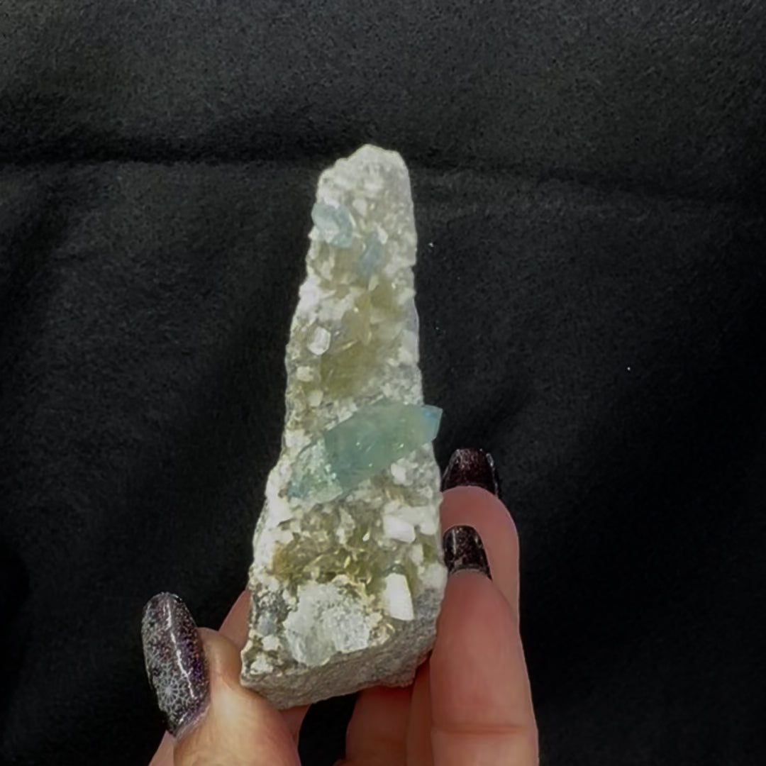 Aquamarine is a form of Beryl crystal long sought after as a gem and precious stone due to its beautiful blue-green hue and clarity. It is found in many sites across the world, typically associated with granitic pegmatites, and is one of the more common gems although pieces of exceptional hue and clarity are considered fairly rare and can be extremely valuable. Aquamarine has a hexagonal crystal structure and is highly prismatic.