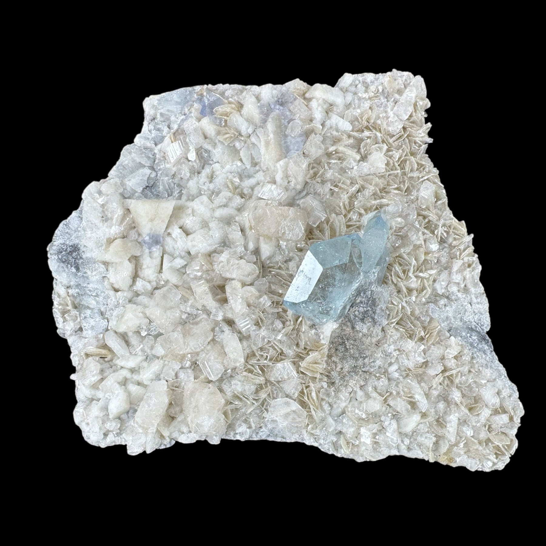 These incredible specimens of natural uncut aquamarine from Mount Little Xuebaoding in Sichuan, China, are found in a matrix of thick, high shine mica and range in hue from nearly clear to classic sea green to deep blue. Each of these pieces contain remarkable aquamarine crystal formations - some gem quality - for the true collector.