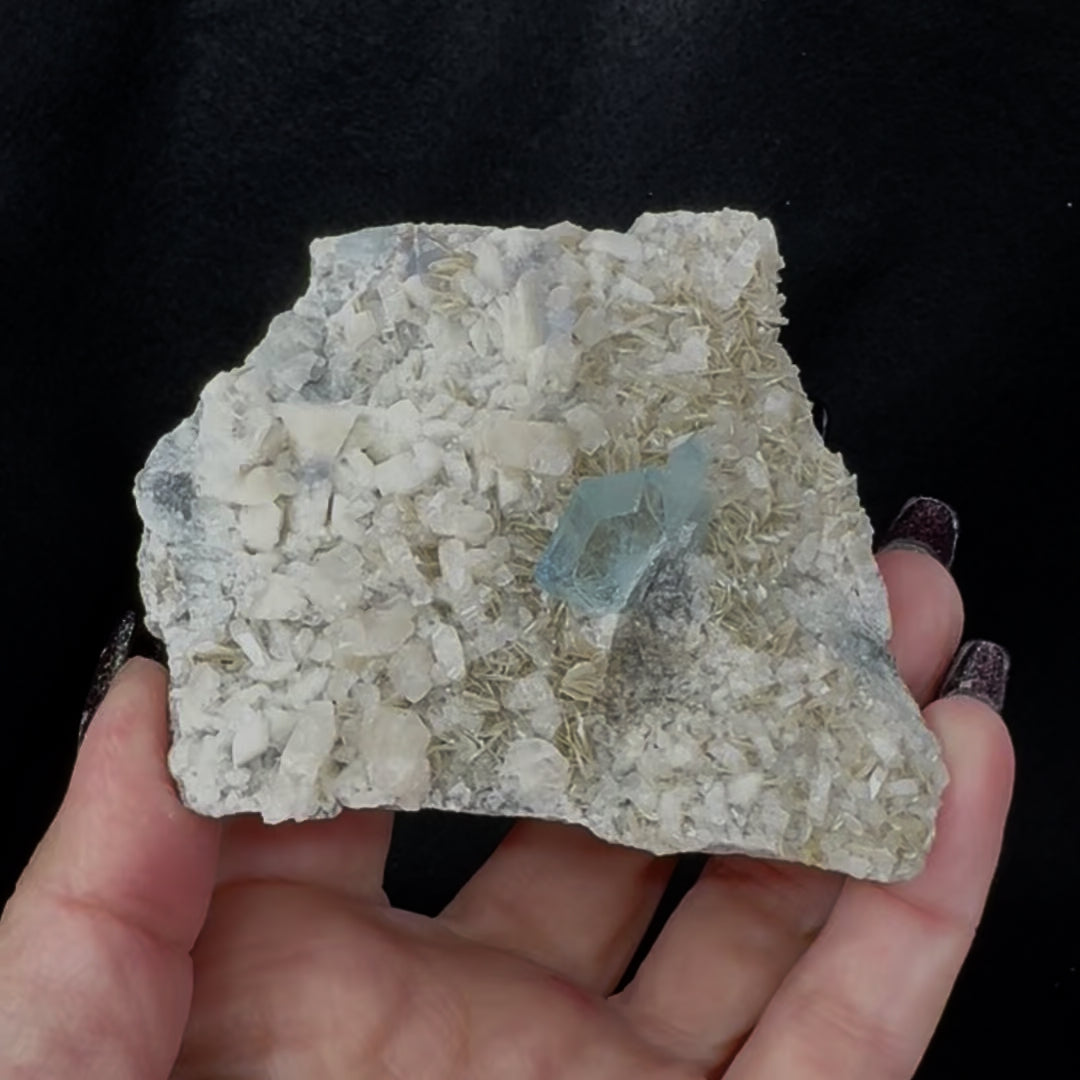 Aquamarine is a form of Beryl crystal long sought after as a gem and precious stone due to its beautiful blue-green hue and clarity. It is found in many sites across the world, typically associated with granitic pegmatites, and is one of the more common gems although pieces of exceptional hue and clarity are considered fairly rare and can be extremely valuable. Aquamarine has a hexagonal crystal structure and is highly prismatic.