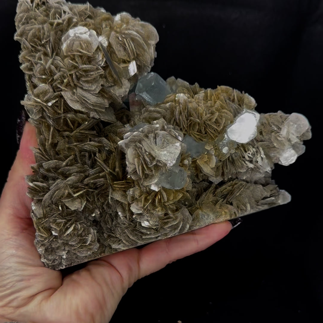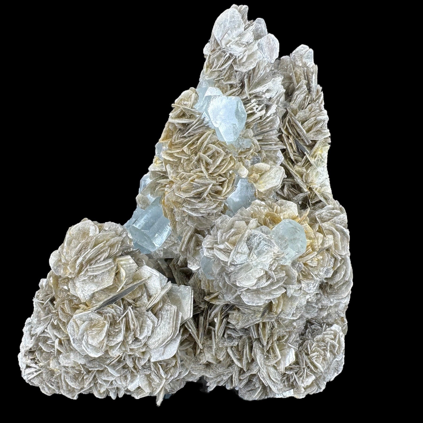 This large, one-of-a-kind show piece contains multiple pieces of large natural uncut aquamarine with high clarity and exceptional hue. They are found within a stunning large cut of thick mica rosettes, the slight yellow tint of which perfectly highlights the sea green crystals. An unparalleled collector's piece.