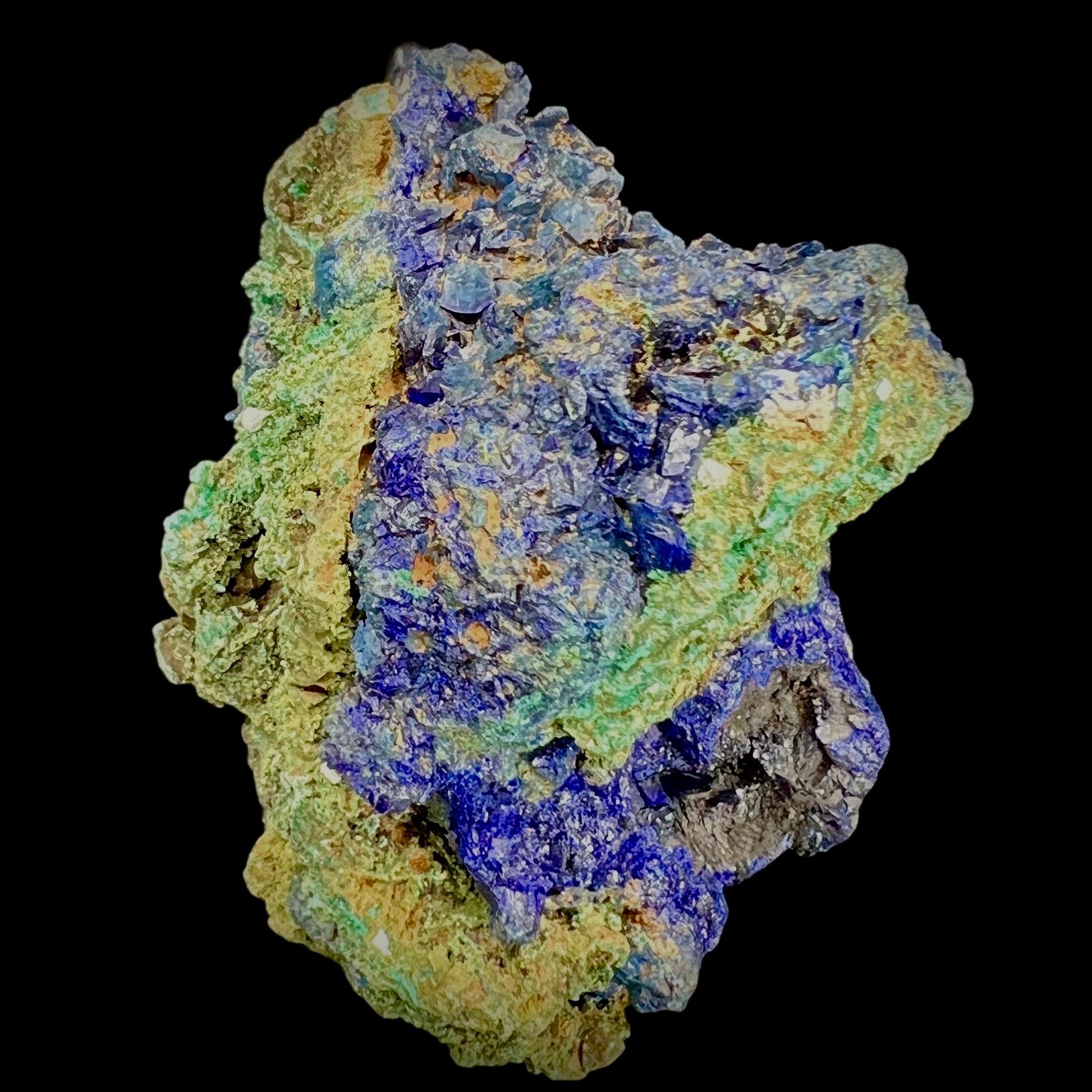 Azurite is a striking copper-based mineral found in shades of deep blue to vivid green, sometimes in the same formations. It is a relatively soft mineral, and when exposed to the elements over a long period of time can change into the closely related malachite. Due to its incredibly vivid and deep coloration, Azurite has been sought after since ancient times as a gem and for use in blue pigment. Our specimens consist of fine crystals spread across a matrix in shades of both blue and green.