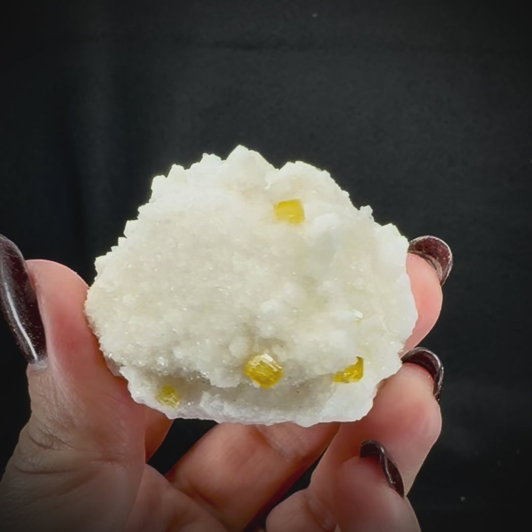 Barite is a mineral with an interesting history, a crystal occurring in a wide variety of colors and forms. Named for the Greek word for “heavy”, it is largely mined as an industrial ore across the globe, with uses in various industries including oil drilling. As a mineral specimen or gemstone Barite can be found in many colors including vibrant reds, pinks, and blues as well as the more commonly encountered clear or pale white. These fine specimens have rich yellow-gold fine crystals covering a thick white matrix.