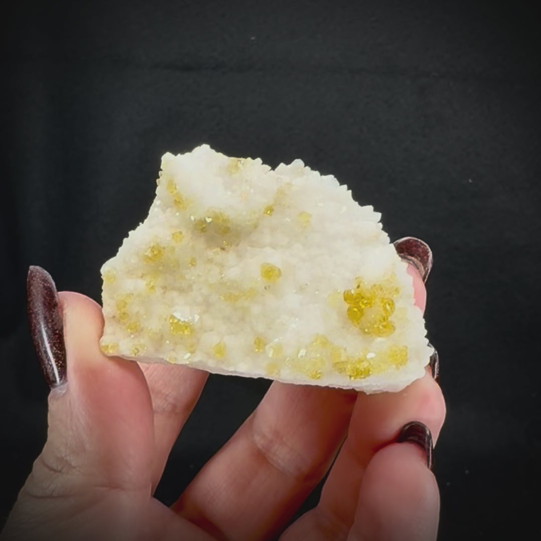 Barite is a mineral with an interesting history, a crystal occurring in a wide variety of colors and forms. Named for the Greek word for “heavy”, it is largely mined as an industrial ore across the globe, with uses in various industries including oil drilling. As a mineral specimen or gemstone Barite can be found in many colors including vibrant reds, pinks, and blues as well as the more commonly encountered clear or pale white. These fine specimens have rich yellow-gold fine crystals covering a thick white matrix.