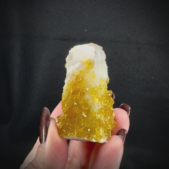 Barite is a mineral with an interesting history, a crystal occurring in a wide variety of colors and forms. Named for the Greek word for “heavy”, it is largely mined as an industrial ore across the globe, with uses in various industries including oil drilling. As a mineral specimen or gemstone Barite can be found in many colors including vibrant reds, pinks, and blues as well as the more commonly encountered clear or pale white. These fine specimens have rich yellow-gold fine crystals covering a thick white matrix.