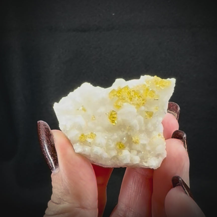Barite is a mineral with an interesting history, a crystal occurring in a wide variety of colors and forms. Named for the Greek word for “heavy”, it is largely mined as an industrial ore across the globe, with uses in various industries including oil drilling. As a mineral specimen or gemstone Barite can be found in many colors including vibrant reds, pinks, and blues as well as the more commonly encountered clear or pale white. These fine specimens have rich yellow-gold fine crystals covering a thick white matrix.