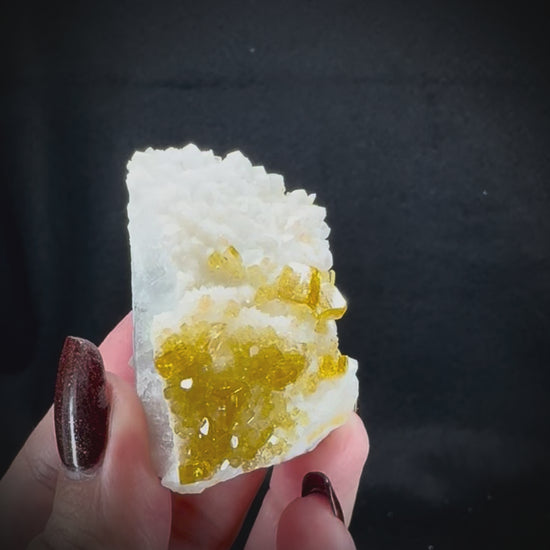 Barite is a mineral with an interesting history, a crystal occurring in a wide variety of colors and forms. Named for the Greek word for “heavy”, it is largely mined as an industrial ore across the globe, with uses in various industries including oil drilling. As a mineral specimen or gemstone Barite can be found in many colors including vibrant reds, pinks, and blues as well as the more commonly encountered clear or pale white. These fine specimens have rich yellow-gold fine crystals covering a thick white matrix.