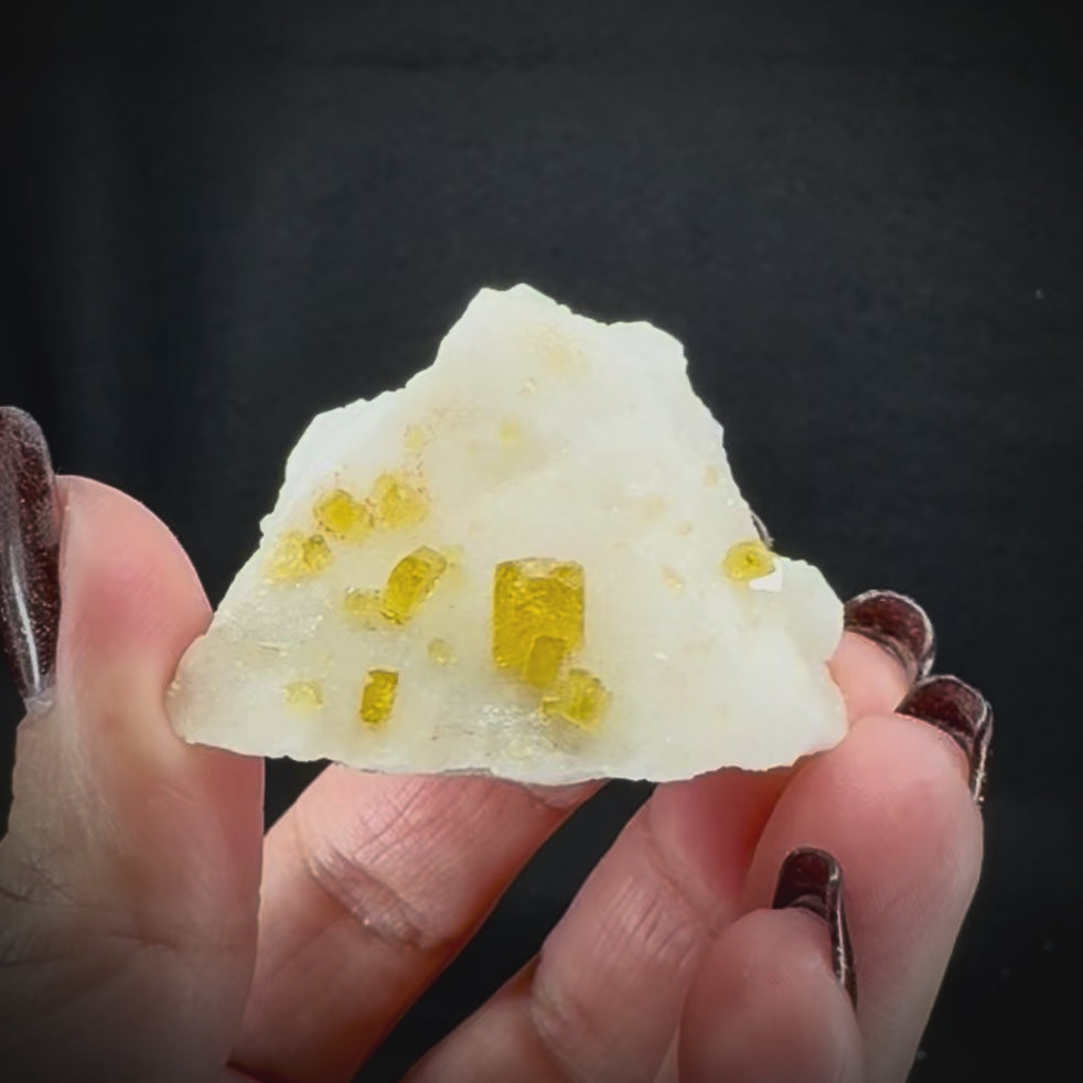 Barite is a mineral with an interesting history, a crystal occurring in a wide variety of colors and forms. Named for the Greek word for “heavy”, it is largely mined as an industrial ore across the globe, with uses in various industries including oil drilling. As a mineral specimen or gemstone Barite can be found in many colors including vibrant reds, pinks, and blues as well as the more commonly encountered clear or pale white. These fine specimens have rich yellow-gold fine crystals covering a thick white matrix.