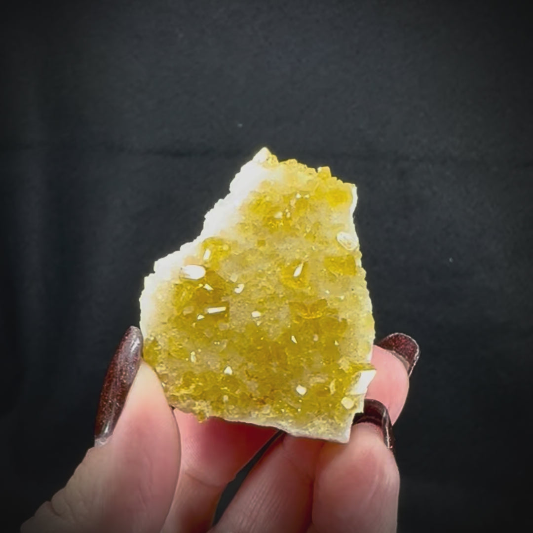 Barite is a mineral with an interesting history, a crystal occurring in a wide variety of colors and forms. Named for the Greek word for “heavy”, it is largely mined as an industrial ore across the globe, with uses in various industries including oil drilling. As a mineral specimen or gemstone Barite can be found in many colors including vibrant reds, pinks, and blues as well as the more commonly encountered clear or pale white. These fine specimens have rich yellow-gold fine crystals covering a thick white matrix.