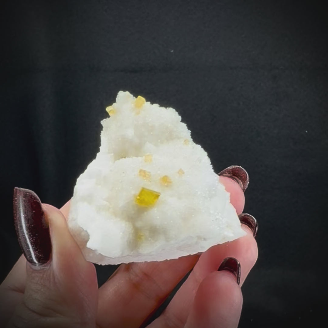 Barite is a mineral with an interesting history, a crystal occurring in a wide variety of colors and forms. Named for the Greek word for “heavy”, it is largely mined as an industrial ore across the globe, with uses in various industries including oil drilling. As a mineral specimen or gemstone Barite can be found in many colors including vibrant reds, pinks, and blues as well as the more commonly encountered clear or pale white. These fine specimens have rich yellow-gold fine crystals covering a thick white matrix.