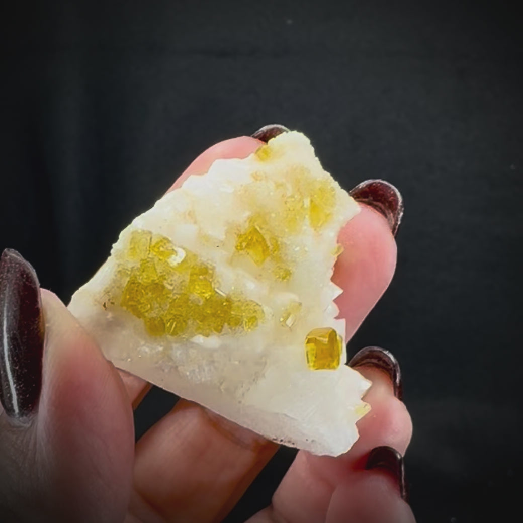 Barite is a mineral with an interesting history, a crystal occurring in a wide variety of colors and forms. Named for the Greek word for “heavy”, it is largely mined as an industrial ore across the globe, with uses in various industries including oil drilling. As a mineral specimen or gemstone Barite can be found in many colors including vibrant reds, pinks, and blues as well as the more commonly encountered clear or pale white. These fine specimens have rich yellow-gold fine crystals covering a thick white matrix.