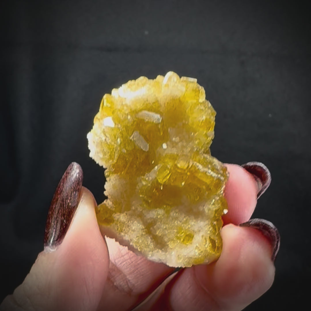 Barite is a mineral with an interesting history, a crystal occurring in a wide variety of colors and forms. Named for the Greek word for “heavy”, it is largely mined as an industrial ore across the globe, with uses in various industries including oil drilling. As a mineral specimen or gemstone Barite can be found in many colors including vibrant reds, pinks, and blues as well as the more commonly encountered clear or pale white. These fine specimens have rich yellow-gold fine crystals covering a thick white matrix.