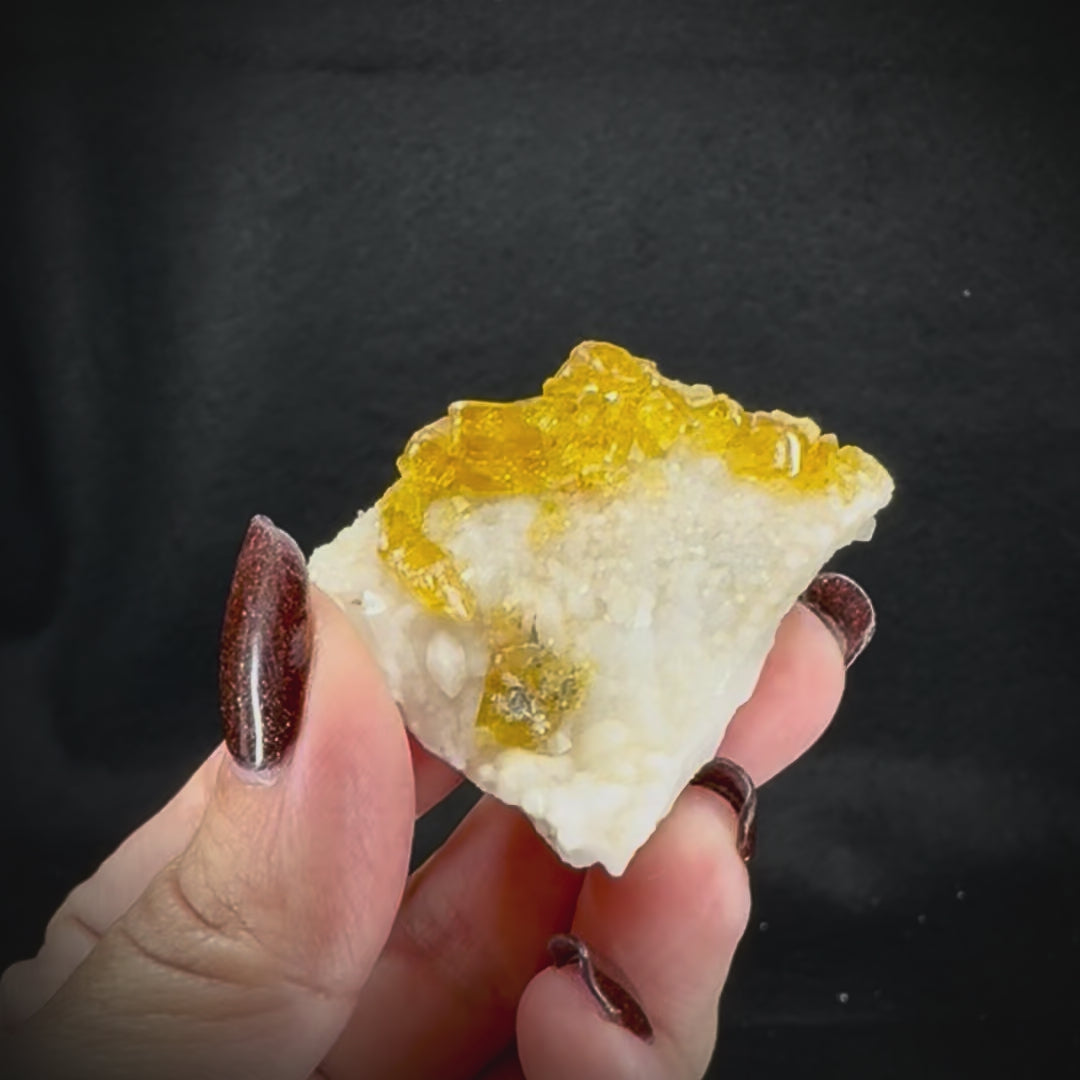 Barite is a mineral with an interesting history, a crystal occurring in a wide variety of colors and forms. Named for the Greek word for “heavy”, it is largely mined as an industrial ore across the globe, with uses in various industries including oil drilling. As a mineral specimen or gemstone Barite can be found in many colors including vibrant reds, pinks, and blues as well as the more commonly encountered clear or pale white. These fine specimens have rich yellow-gold fine crystals covering a thick white matrix.