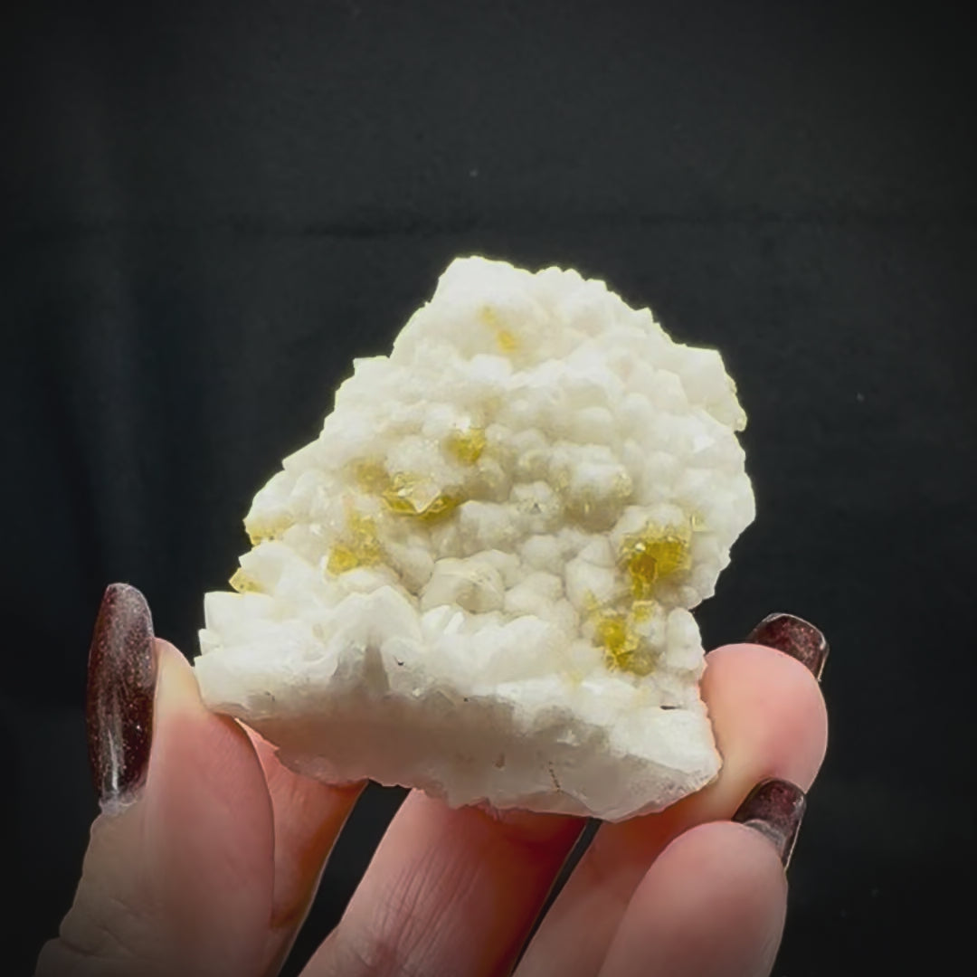 Barite is a mineral with an interesting history, a crystal occurring in a wide variety of colors and forms. Named for the Greek word for “heavy”, it is largely mined as an industrial ore across the globe, with uses in various industries including oil drilling. As a mineral specimen or gemstone Barite can be found in many colors including vibrant reds, pinks, and blues as well as the more commonly encountered clear or pale white. These fine specimens have rich yellow-gold fine crystals covering a thick white matrix.