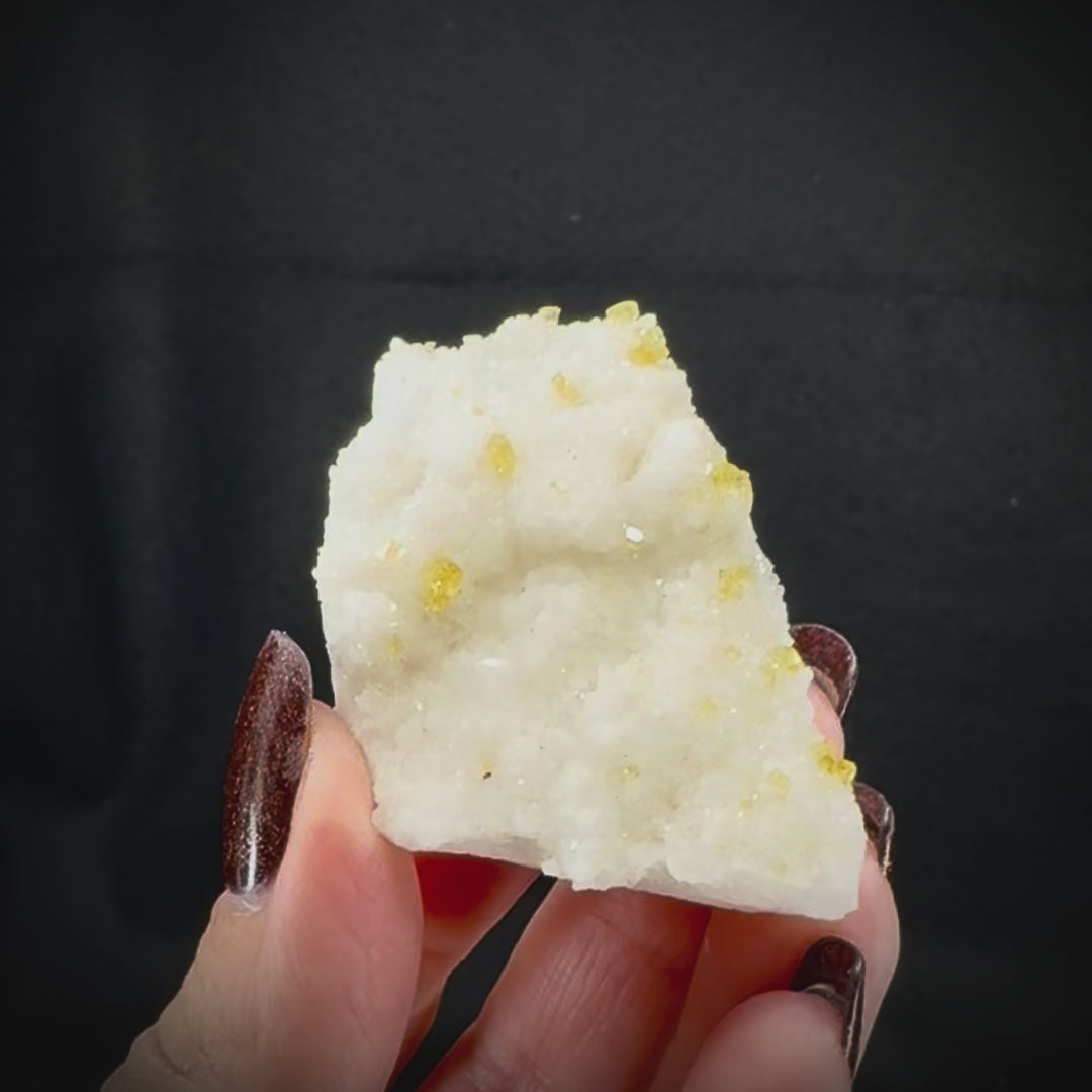 Barite is a mineral with an interesting history, a crystal occurring in a wide variety of colors and forms. Named for the Greek word for “heavy”, it is largely mined as an industrial ore across the globe, with uses in various industries including oil drilling. As a mineral specimen or gemstone Barite can be found in many colors including vibrant reds, pinks, and blues as well as the more commonly encountered clear or pale white. These fine specimens have rich yellow-gold fine crystals covering a thick white matrix.