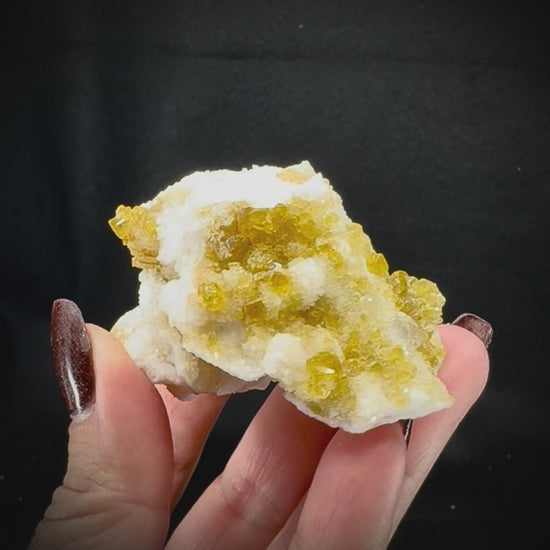 Barite is a mineral with an interesting history, a crystal occurring in a wide variety of colors and forms. Named for the Greek word for “heavy”, it is largely mined as an industrial ore across the globe, with uses in various industries including oil drilling. As a mineral specimen or gemstone Barite can be found in many colors including vibrant reds, pinks, and blues as well as the more commonly encountered clear or pale white. These fine specimens have rich yellow-gold fine crystals covering a thick white matrix.