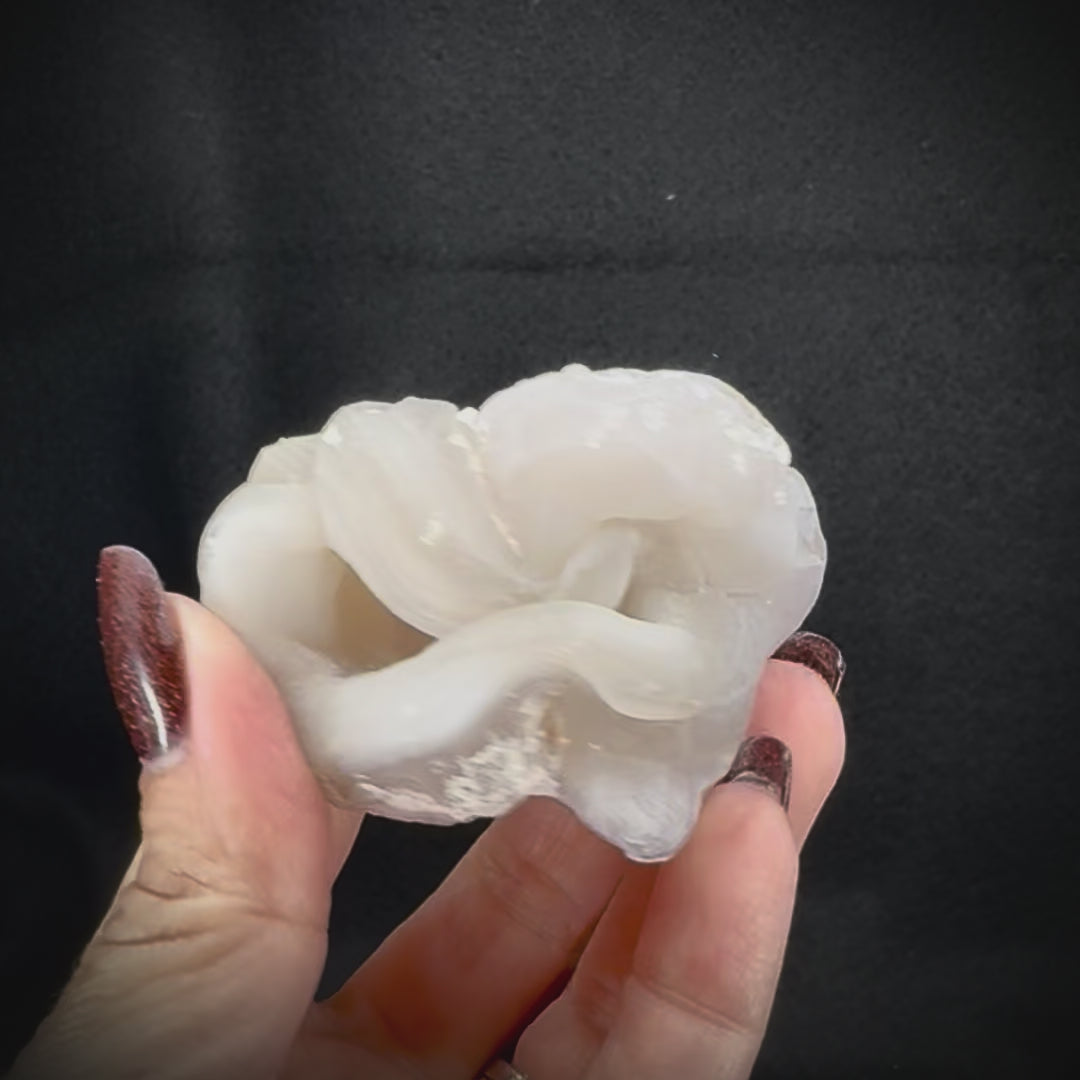 A silicone-based mineral closely related to quartz and agate, Chalcedony has a unique crystalline structure that gives it an enormously variable appearance. This mineral forms in a similar fashion to agates and geodes but due to heat and pressure at the time of formation results in a distinct look and almost silky texture. Chalcedony can be found in a range of colors but most often occurs in semitransparent or white. It has a long archaeological record of human use as a cutting or carving tool, dating back as far as 32,000 BC. Chalcedony has a number of forms that are also considered gems of their own, such as agates, carnelian, and onyx. These unique, highly variable Chalcedony spheres or roses are almost geode-like in appearance and one can clearly see the process of geode or agate formation in progress in each specimen.