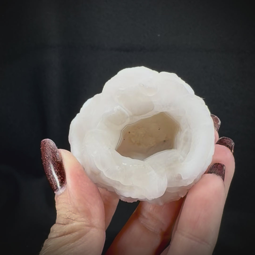 A silicone-based mineral closely related to quartz and agate, Chalcedony has a unique crystalline structure that gives it an enormously variable appearance. This mineral forms in a similar fashion to agates and geodes but due to heat and pressure at the time of formation results in a distinct look and almost silky texture. Chalcedony can be found in a range of colors but most often occurs in semitransparent or white. It has a long archaeological record of human use as a cutting or carving tool, dating back as far as 32,000 BC. Chalcedony has a number of forms that are also considered gems of their own, such as agates, carnelian, and onyx. These unique, highly variable Chalcedony spheres or roses are almost geode-like in appearance and one can clearly see the process of geode or agate formation in progress in each specimen.