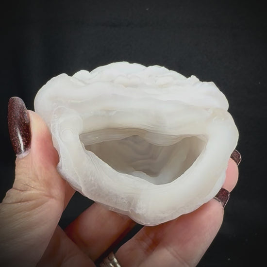 A silicone-based mineral closely related to quartz and agate, Chalcedony has a unique crystalline structure that gives it an enormously variable appearance. This mineral forms in a similar fashion to agates and geodes but due to heat and pressure at the time of formation results in a distinct look and almost silky texture. Chalcedony can be found in a range of colors but most often occurs in semitransparent or white. It has a long archaeological record of human use as a cutting or carving tool, dating back as far as 32,000 BC. Chalcedony has a number of forms that are also considered gems of their own, such as agates, carnelian, and onyx. These unique, highly variable Chalcedony spheres or roses are almost geode-like in appearance and one can clearly see the process of geode or agate formation in progress in each specimen.