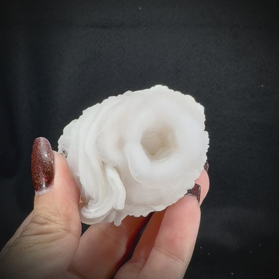 A silicone-based mineral closely related to quartz and agate, Chalcedony has a unique crystalline structure that gives it an enormously variable appearance. This mineral forms in a similar fashion to agates and geodes but due to heat and pressure at the time of formation results in a distinct look and almost silky texture. Chalcedony can be found in a range of colors but most often occurs in semitransparent or white. It has a long archaeological record of human use as a cutting or carving tool, dating back as far as 32,000 BC. Chalcedony has a number of forms that are also considered gems of their own, such as agates, carnelian, and onyx. These unique, highly variable Chalcedony spheres or roses are almost geode-like in appearance and one can clearly see the process of geode or agate formation in progress in each specimen.