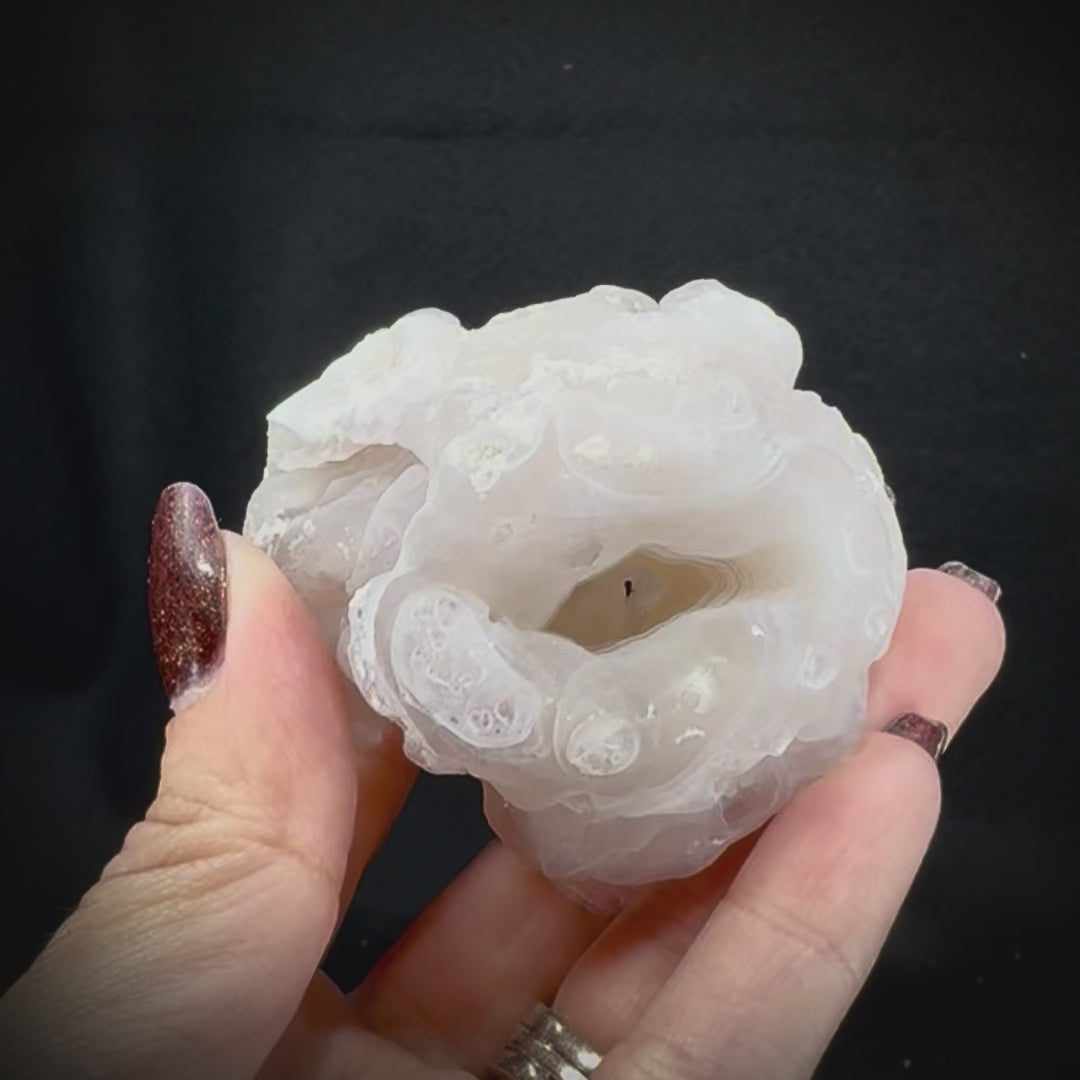 A silicone-based mineral closely related to quartz and agate, Chalcedony has a unique crystalline structure that gives it an enormously variable appearance. This mineral forms in a similar fashion to agates and geodes but due to heat and pressure at the time of formation results in a distinct look and almost silky texture. Chalcedony can be found in a range of colors but most often occurs in semitransparent or white. It has a long archaeological record of human use as a cutting or carving tool, dating back as far as 32,000 BC. Chalcedony has a number of forms that are also considered gems of their own, such as agates, carnelian, and onyx. These unique, highly variable Chalcedony spheres or roses are almost geode-like in appearance and one can clearly see the process of geode or agate formation in progress in each specimen.