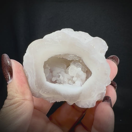 A silicone-based mineral closely related to quartz and agate, Chalcedony has a unique crystalline structure that gives it an enormously variable appearance. This mineral forms in a similar fashion to agates and geodes but due to heat and pressure at the time of formation results in a distinct look and almost silky texture. Chalcedony can be found in a range of colors but most often occurs in semitransparent or white. It has a long archaeological record of human use as a cutting or carving tool, dating back as far as 32,000 BC. Chalcedony has a number of forms that are also considered gems of their own, such as agates, carnelian, and onyx. These unique, highly variable Chalcedony spheres or roses are almost geode-like in appearance and one can clearly see the process of geode or agate formation in progress in each specimen.