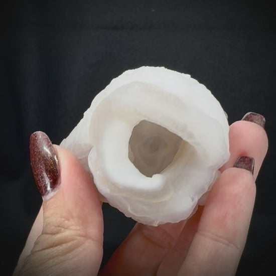 A silicone-based mineral closely related to quartz and agate, Chalcedony has a unique crystalline structure that gives it an enormously variable appearance. This mineral forms in a similar fashion to agates and geodes but due to heat and pressure at the time of formation results in a distinct look and almost silky texture. Chalcedony can be found in a range of colors but most often occurs in semitransparent or white. It has a long archaeological record of human use as a cutting or carving tool, dating back as far as 32,000 BC. Chalcedony has a number of forms that are also considered gems of their own, such as agates, carnelian, and onyx. These unique, highly variable Chalcedony spheres or roses are almost geode-like in appearance and one can clearly see the process of geode or agate formation in progress in each specimen.