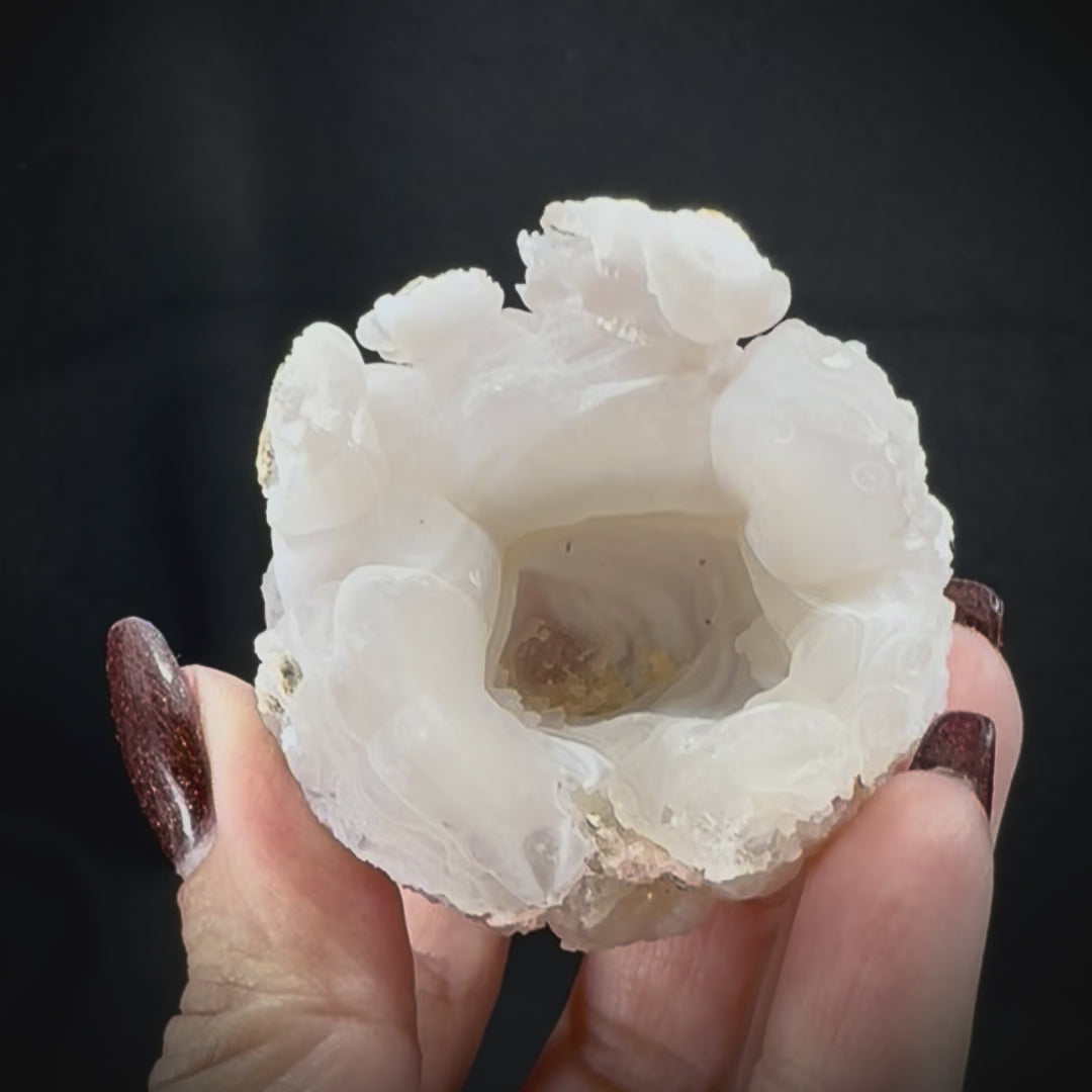 A silicone-based mineral closely related to quartz and agate, Chalcedony has a unique crystalline structure that gives it an enormously variable appearance. This mineral forms in a similar fashion to agates and geodes but due to heat and pressure at the time of formation results in a distinct look and almost silky texture. Chalcedony can be found in a range of colors but most often occurs in semitransparent or white. It has a long archaeological record of human use as a cutting or carving tool, dating back as far as 32,000 BC. Chalcedony has a number of forms that are also considered gems of their own, such as agates, carnelian, and onyx. These unique, highly variable Chalcedony spheres or roses are almost geode-like in appearance and one can clearly see the process of geode or agate formation in progress in each specimen.