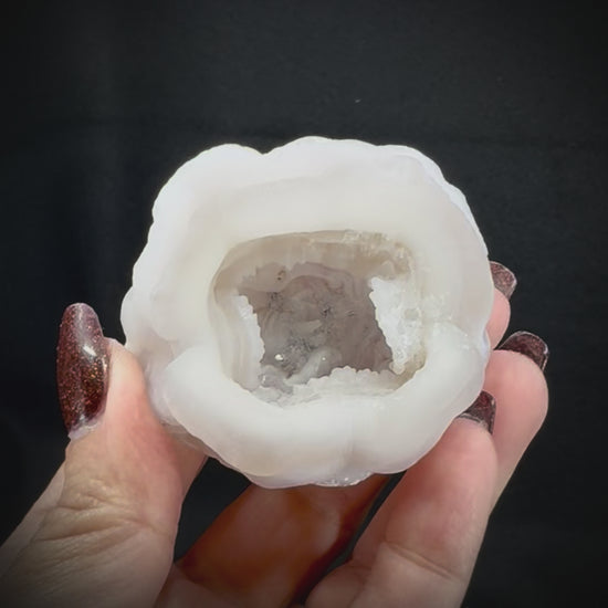 A silicone-based mineral closely related to quartz and agate, Chalcedony has a unique crystalline structure that gives it an enormously variable appearance. This mineral forms in a similar fashion to agates and geodes but due to heat and pressure at the time of formation results in a distinct look and almost silky texture. Chalcedony can be found in a range of colors but most often occurs in semitransparent or white. It has a long archaeological record of human use as a cutting or carving tool, dating back as far as 32,000 BC. Chalcedony has a number of forms that are also considered gems of their own, such as agates, carnelian, and onyx. These unique, highly variable Chalcedony spheres or roses are almost geode-like in appearance and one can clearly see the process of geode or agate formation in progress in each specimen.