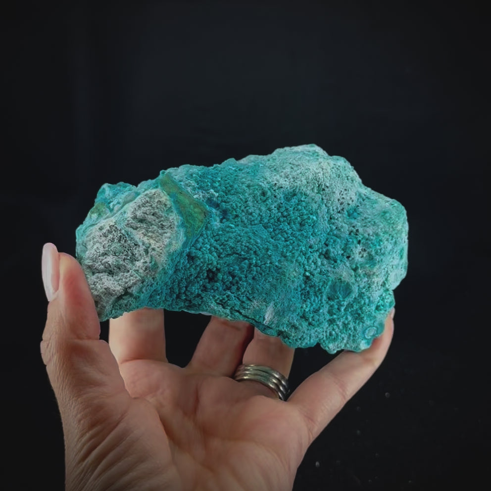 Occurring in spectacular shades of deep green, turquoise, and powder blue, Chrysocolla is unique mineral prized as a precious stone since antiquity for use in jewelry as well as in goldsmithing. Chrysocolla is in the copper family, its color formed from the oxidation of copper and it is typically found in spherical (botryoidal) or rounded formations, often with intricate patterns and shapes.