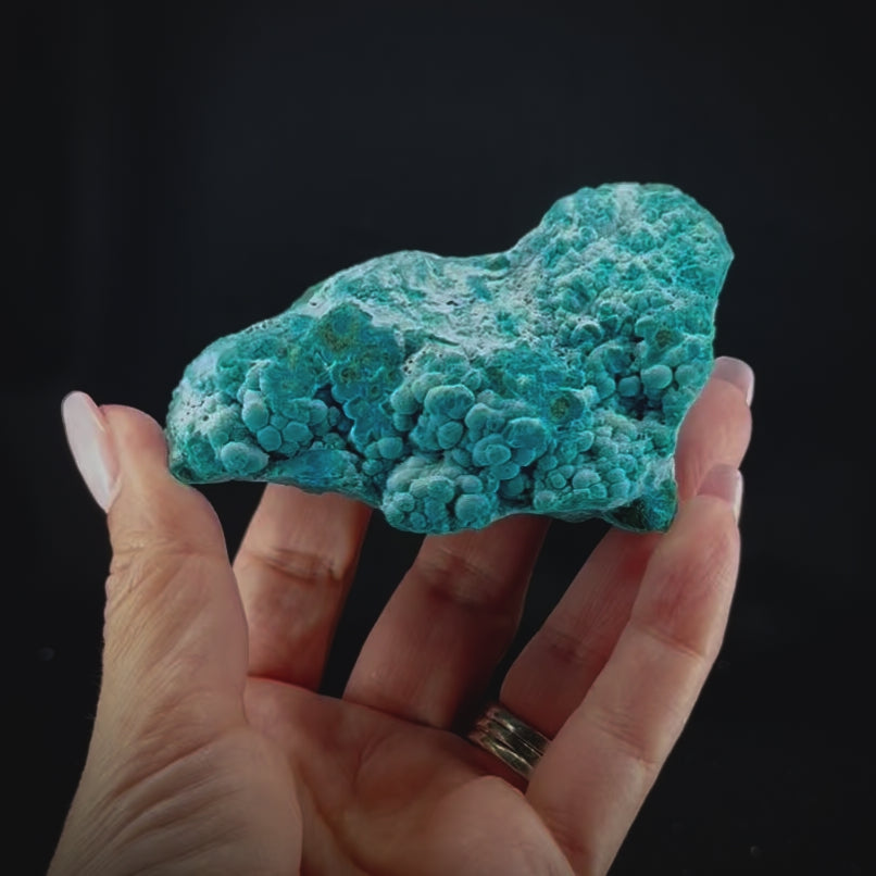 Occurring in spectacular shades of deep green, turquoise, and powder blue, Chrysocolla is unique mineral prized as a precious stone since antiquity for use in jewelry as well as in goldsmithing. Chrysocolla is in the copper family, its color formed from the oxidation of copper and it is typically found in spherical (botryoidal) or rounded formations, often with intricate patterns and shapes.