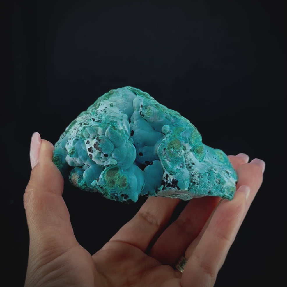 Occurring in spectacular shades of deep green, turquoise, and powder blue, Chrysocolla is unique mineral prized as a precious stone since antiquity for use in jewelry as well as in goldsmithing. Chrysocolla is in the copper family, its color formed from the oxidation of copper and it is typically found in spherical (botryoidal) or rounded formations, often with intricate patterns and shapes.