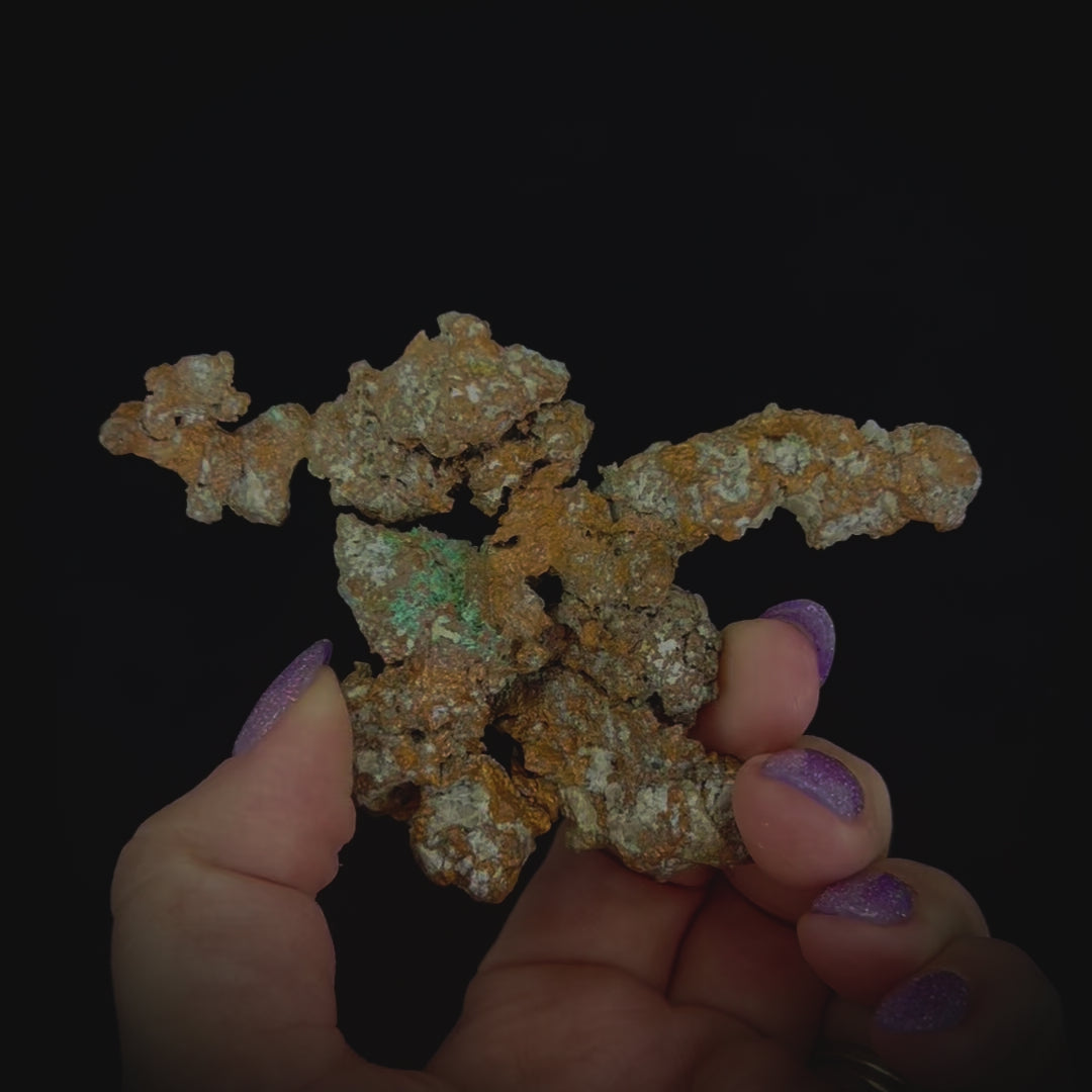A widespread and industrially important mineral, copper has been used by humans as ornamentation, tools, and as a precious metal for thousands of years. The word copper originates from the latin for the island of Cyprus, where early very productive copper mines supplied much of the ancient world with the material. Copper is a so-called native metal, which means it naturally occurs in its metallic form. Natural copper is relatively soft and often found in intricate and unique structures, with nodules and delicate filigree-like branches.