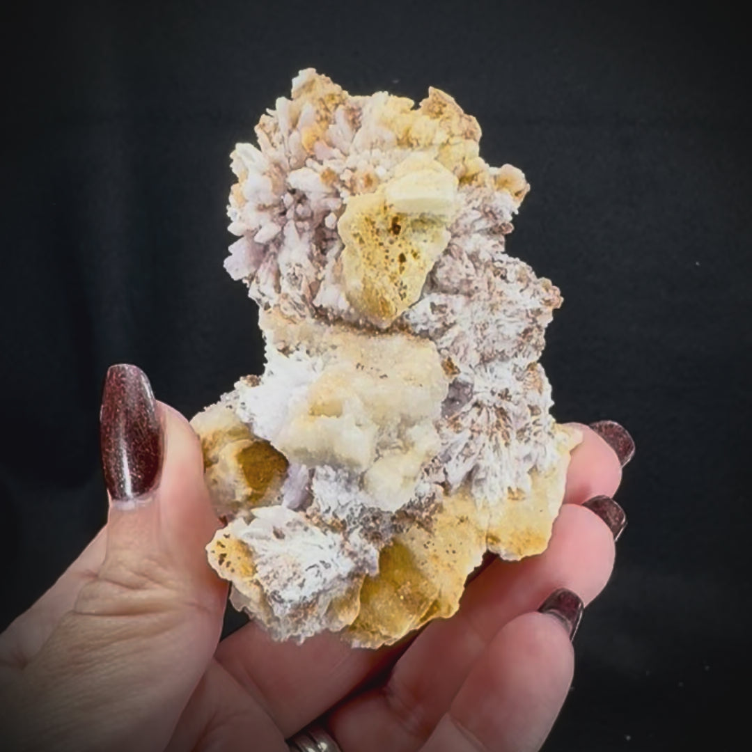 Known for its beautiful prismatic crystals, often radiating outward from a central axis, Creedite is named for the place of its initial discovery, the Creede Quadrangle in Colorado. Creedite is a rare mineral in the hydoxylhalide group and is often formed from the intense oxidation of fluorite formations. Only known from a relatively small number of formations worldwide, Creedite is sought after for its unique fine crystalline structure.