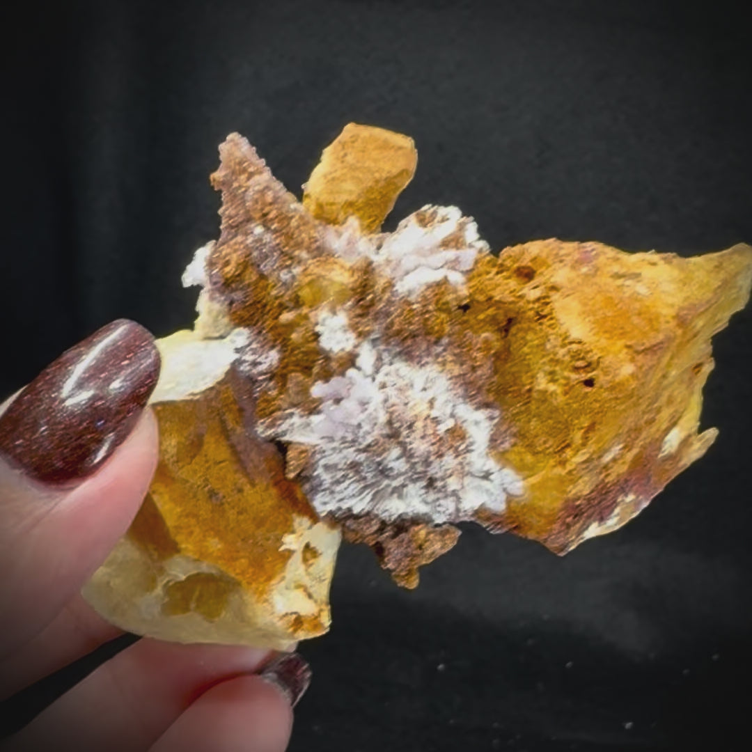 Known for its beautiful prismatic crystals, often radiating outward from a central axis, Creedite is named for the place of its initial discovery, the Creede Quadrangle in Colorado. Creedite is a rare mineral in the hydoxylhalide group and is often formed from the intense oxidation of fluorite formations. Only known from a relatively small number of formations worldwide, Creedite is sought after for its unique fine crystalline structure.