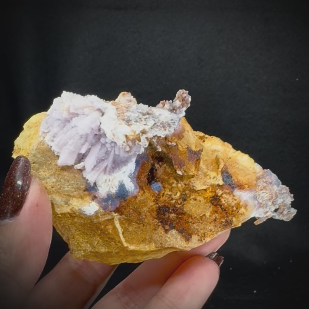 Known for its beautiful prismatic crystals, often radiating outward from a central axis, Creedite is named for the place of its initial discovery, the Creede Quadrangle in Colorado. Creedite is a rare mineral in the hydoxylhalide group and is often formed from the intense oxidation of fluorite formations. Only known from a relatively small number of formations worldwide, Creedite is sought after for its unique fine crystalline structure.
