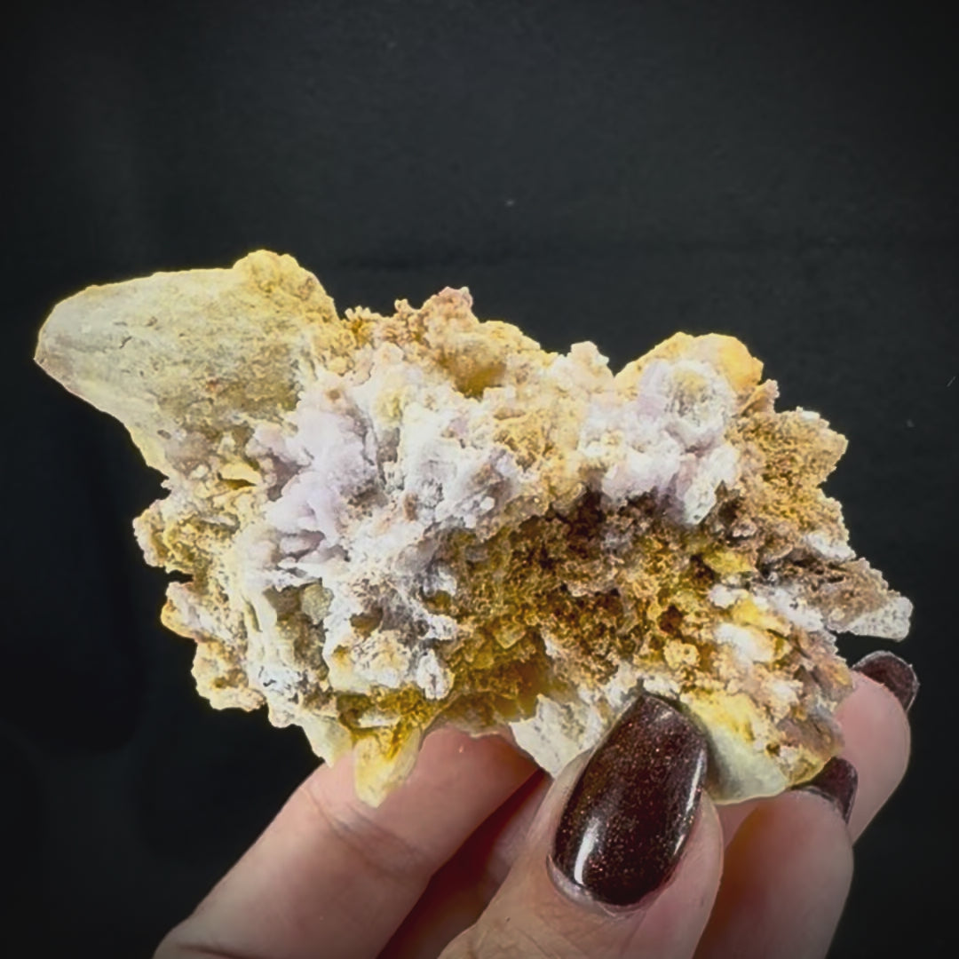Known for its beautiful prismatic crystals, often radiating outward from a central axis, Creedite is named for the place of its initial discovery, the Creede Quadrangle in Colorado. Creedite is a rare mineral in the hydoxylhalide group and is often formed from the intense oxidation of fluorite formations. Only known from a relatively small number of formations worldwide, Creedite is sought after for its unique fine crystalline structure.