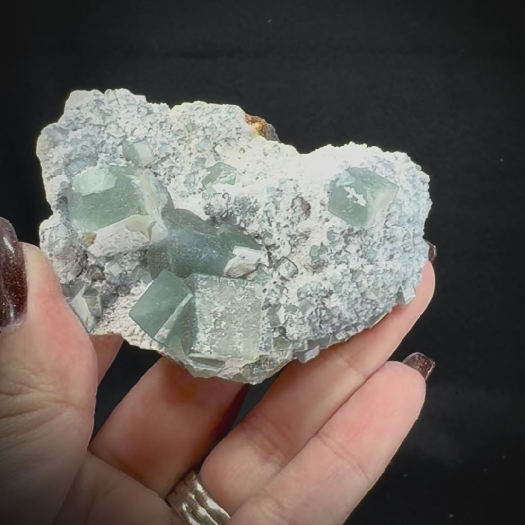 These pieces of cuboidal fluorite crystals in varying shades of dark green occur on a high contrast white-gray matrix.