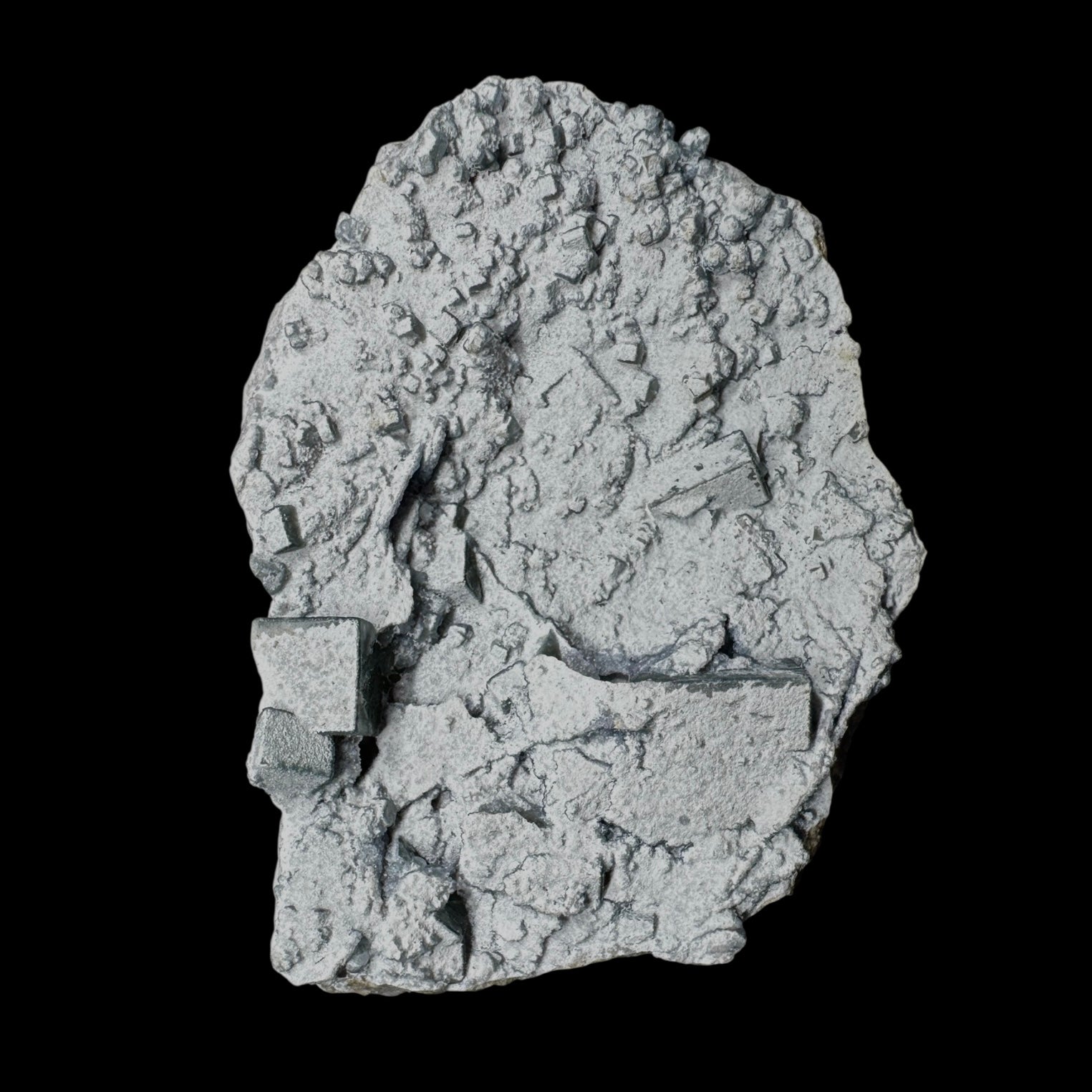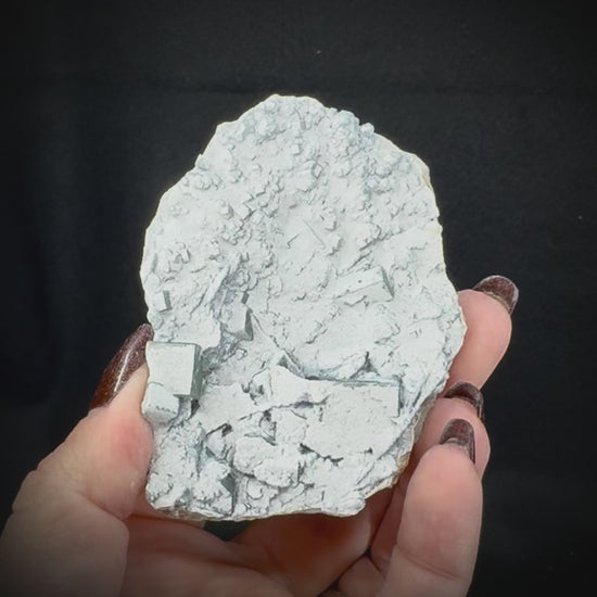 These pieces of cuboidal fluorite crystals in varying shades of dark green occur on a high contrast white-gray matrix.