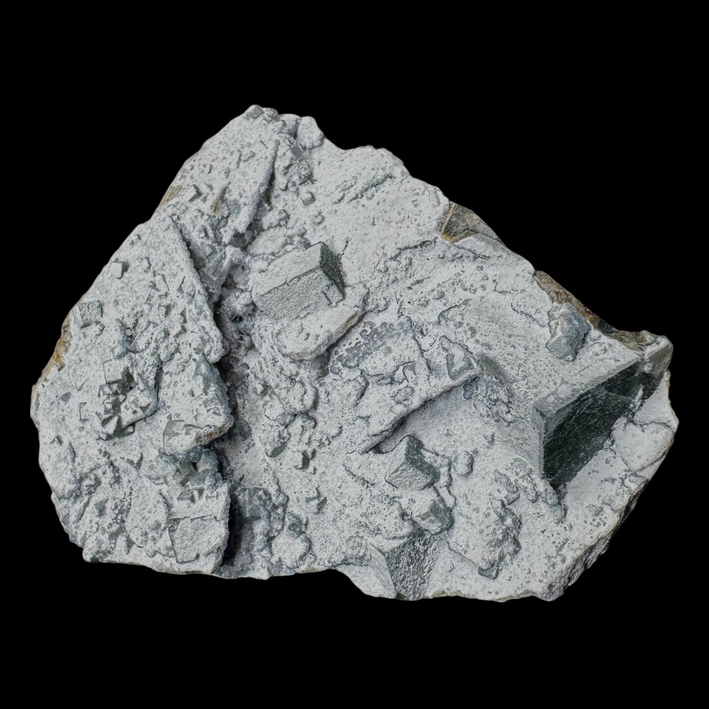 These pieces of cuboidal fluorite crystals in varying shades of dark green occur on a high contrast white-gray matrix.