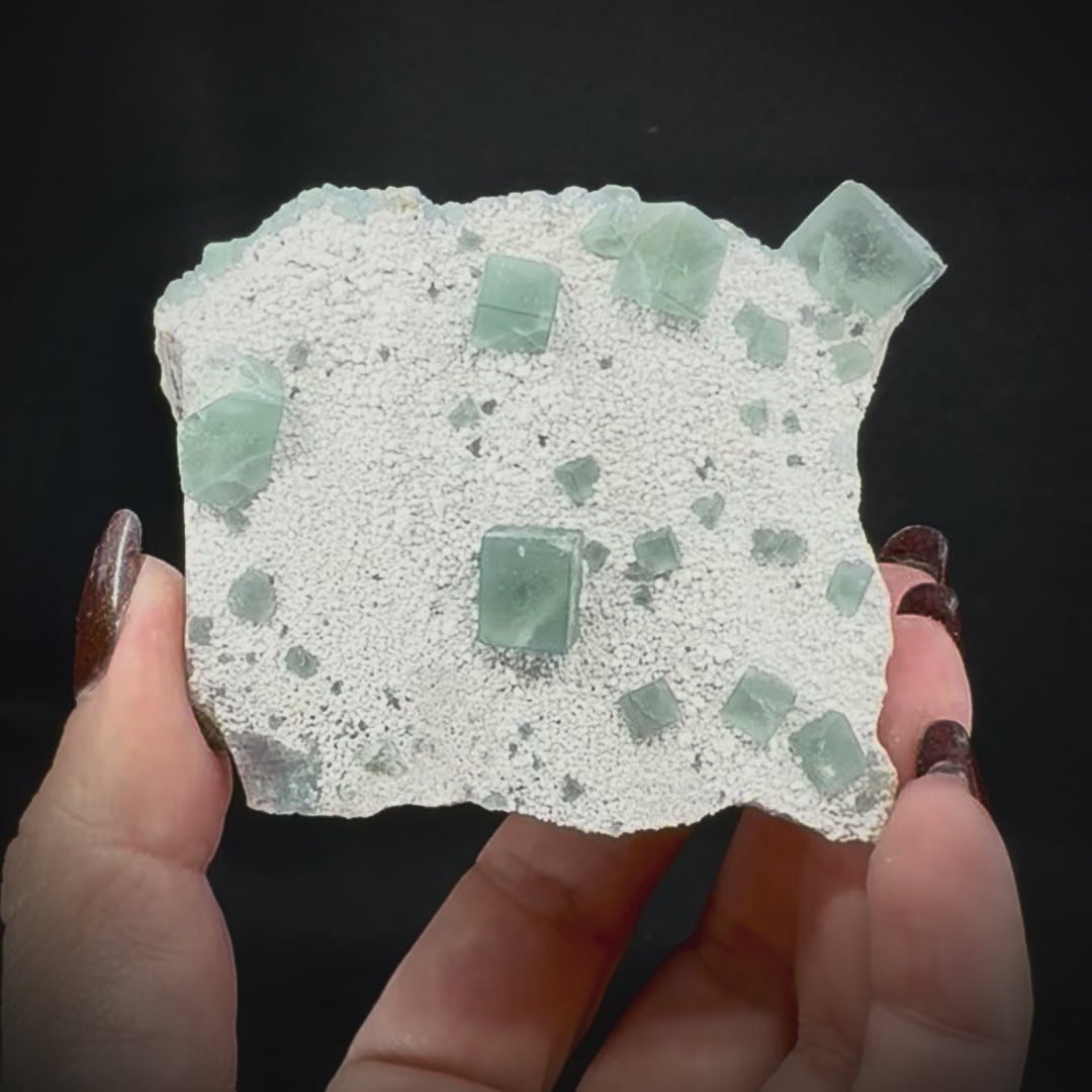 These pieces of cuboidal fluorite crystals in varying shades of dark green occur on a high contrast white-gray matrix.
